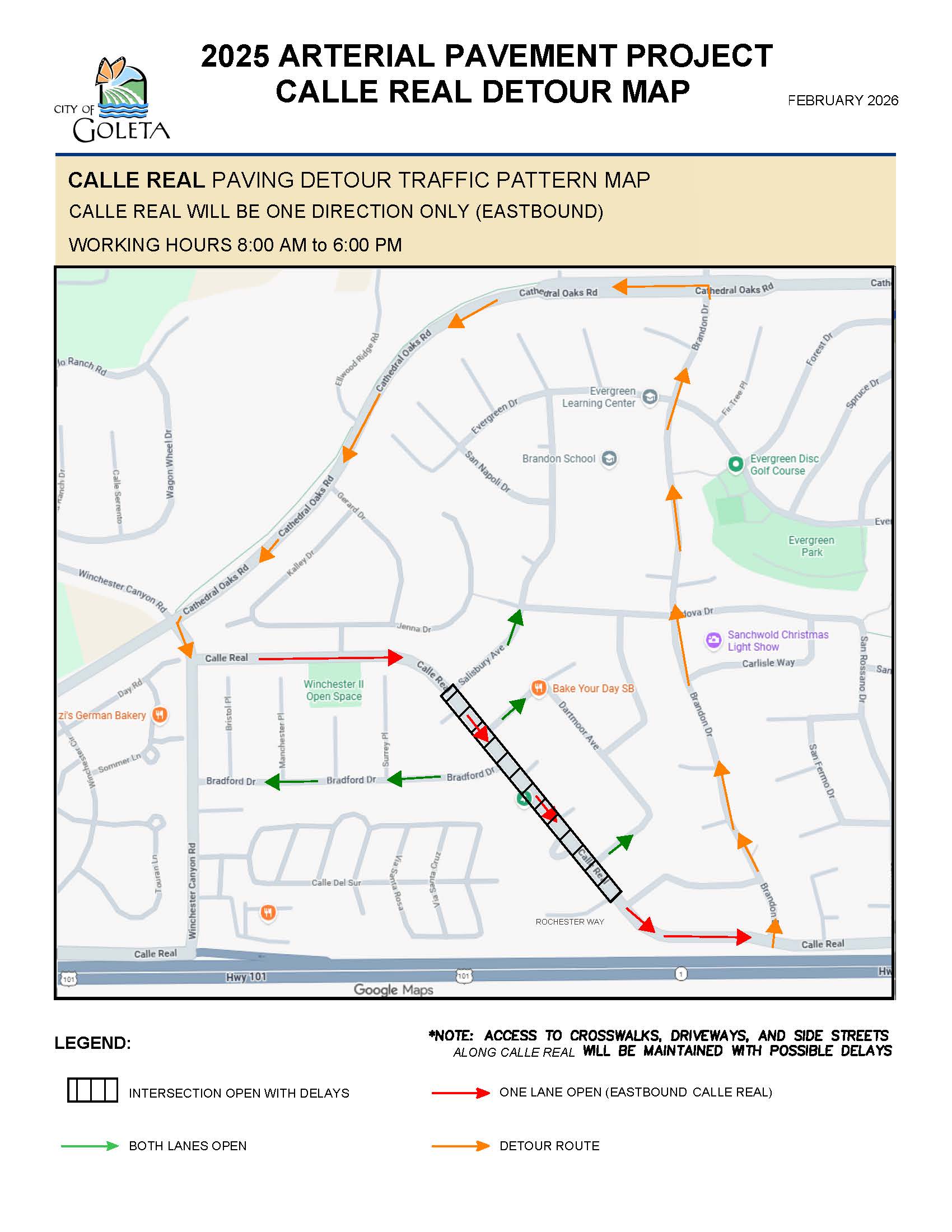 A detour is in place on Calle Real from Winchester Canyon Road to Brandon Drive through Thursday, Feb. 12. The road will be open to eastbound traffic only.